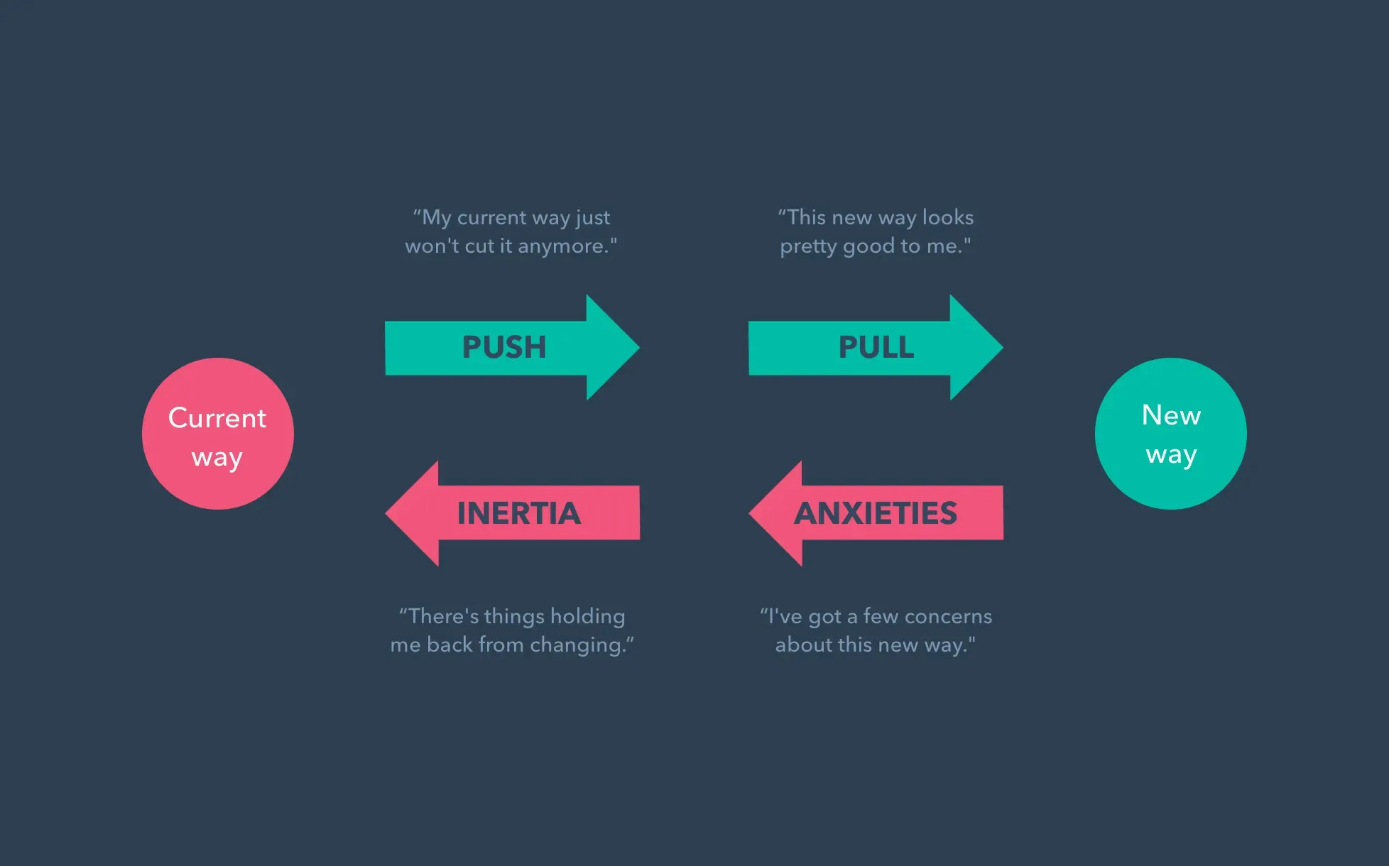 Every customer switching from the current, "old" way to the "new" way is subject to 4 forces (based on Bob Moesta's framework - co-creator of JTBD alongside Clay Christensen).