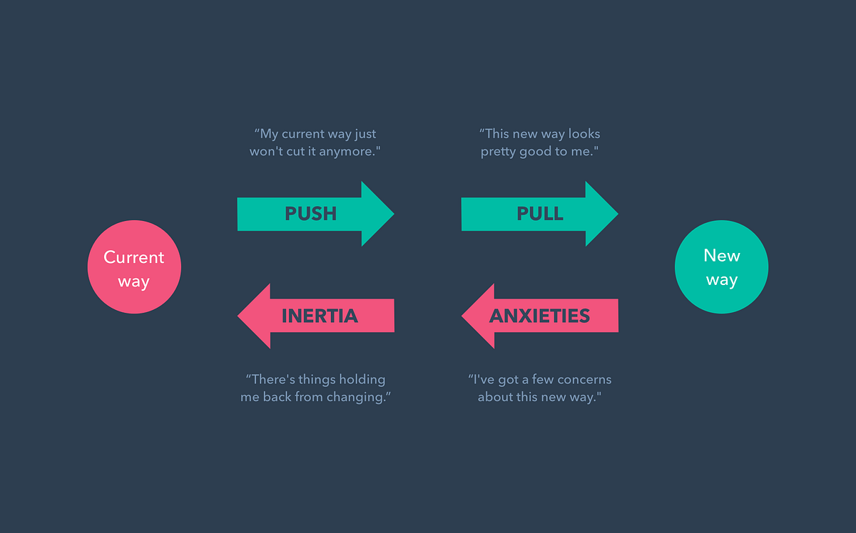 - Pull of the New Solution - What progress do they hope to achieve? The new way (your solution) must act as a magnet (often among the competition).