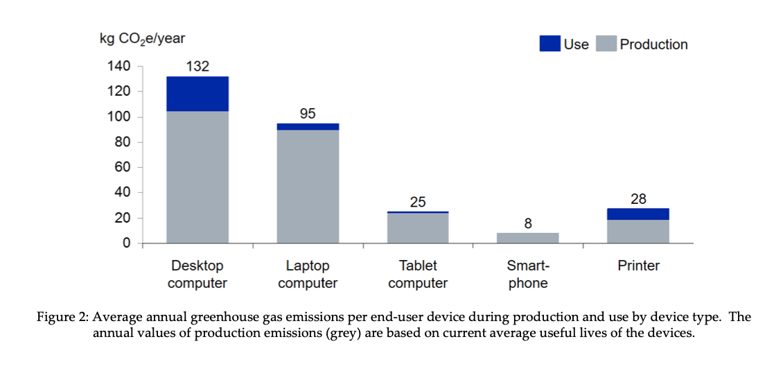 Devices like computers and smartphones must be built and (eventually) destroyed, leading to embedded carbon (for production, maintenance, and dismantling) and carbon emissions during actual usage. As you can see from the drawing below, production takes up the bulk of the emissions.
