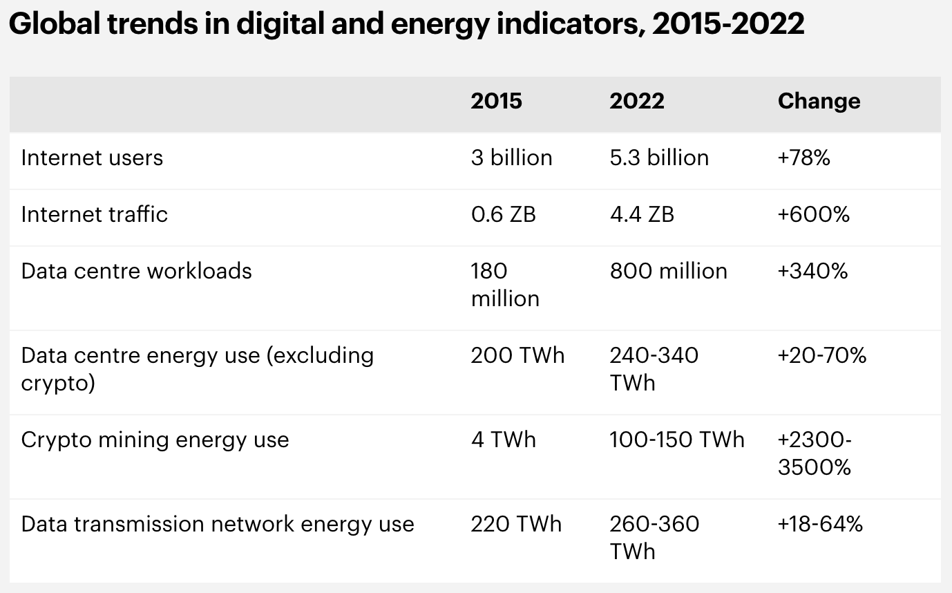 - Crypto mining has emerged as a new (massive) source of energy consumption. GenAI is likely another new use case, but it is not yet visible in these numbers.